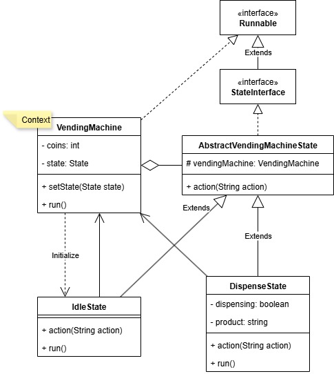 In this example, the VendingMachine is a Runnable class because it keeps listening to console input. The Idle state is inserted as default. It keeps tracks of the number of coins in the machine.